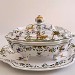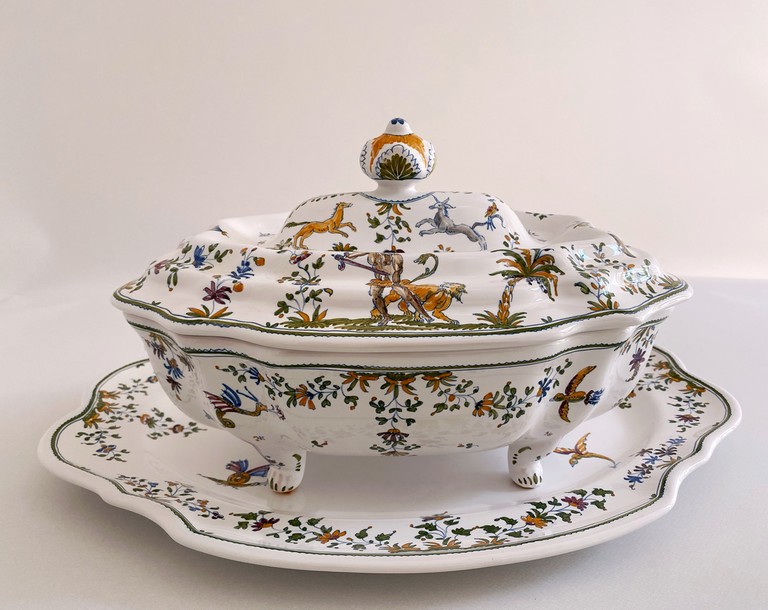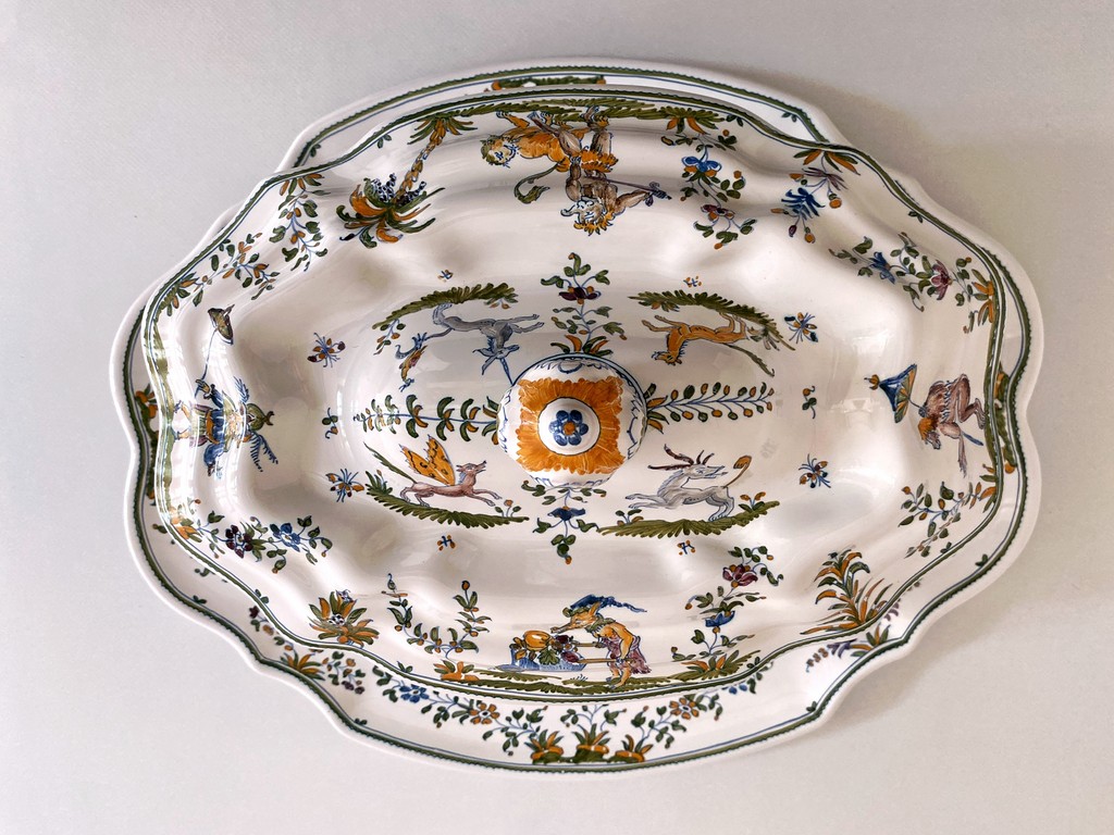 Soupière décor "grotesque" en polychrome présentée sur un plat.Dimension du plat : 42x33cmHauteur de la soupière : 22cm.