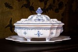 Soupière décor "Berain" style décoratif sous le règne du roi Louis Quatorze. Dimension de la soupière : Hauteur 28cm. Longueur 38cm x largeur 30cm. Dimension du plat : Longueur 47.5cm x largeur 38cm.